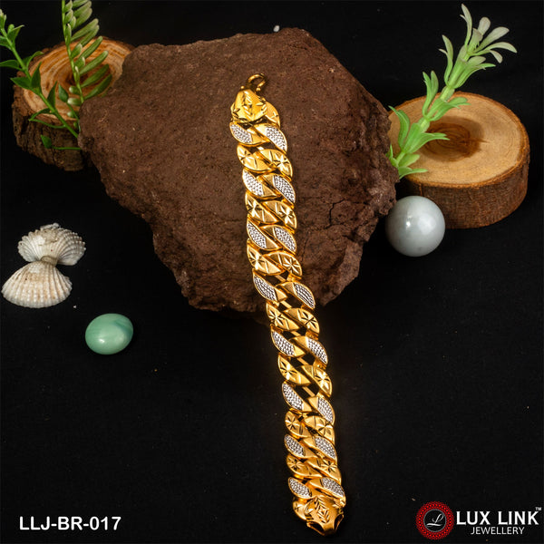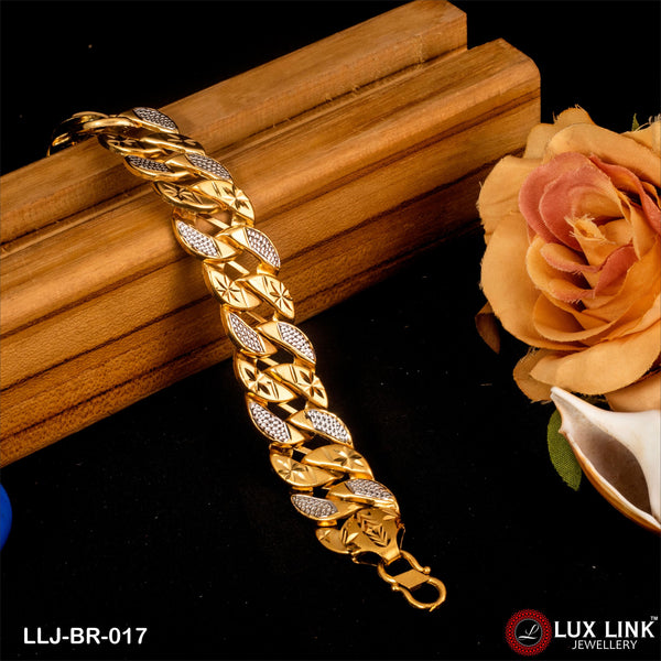 This 1 gram gold-plated Pokal bracelet for men combines a royal, shining appeal with a matt finish and intricate filigree design. Crafted from brass with a hollow structure, it offers a lightweight yet durable accessory that complements any style. Perfect for everyday wear or special occasions, this golden bracelet adds a touch of elegance and sophistication to your look.