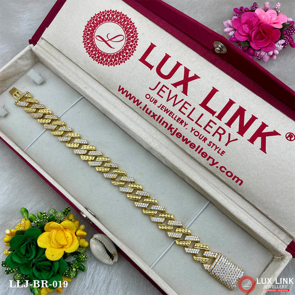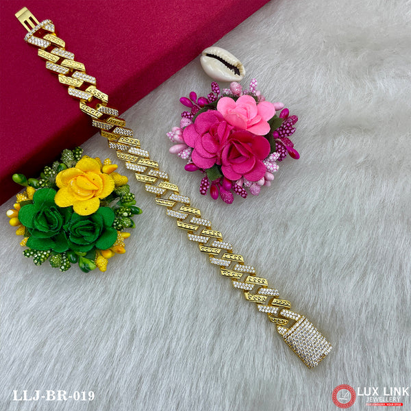 This 1 Gram Gold Plated with Diamond Design High-Quality Bracelet for Men makes a perfect statement for any special occasion. Crafted with a textured and shining royal rhodium finish, the bracelet is miligram gold and boasts a lovely hip hop and gorgeous golden Filigree Design with a fancy diamond accent. It is made with brass for a durable, regular fit.