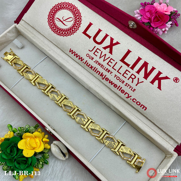 This 1 Gram Gold Plated with Diamond Fashionable Design Bracelet for Men is a men's jewelry piece featuring a textured, shining- plated finish and a miligram gold filigree design with a diamond. Popular for the latest hip hop fashion trends, this timeless brass bracelet will give you a timeless, golden look.