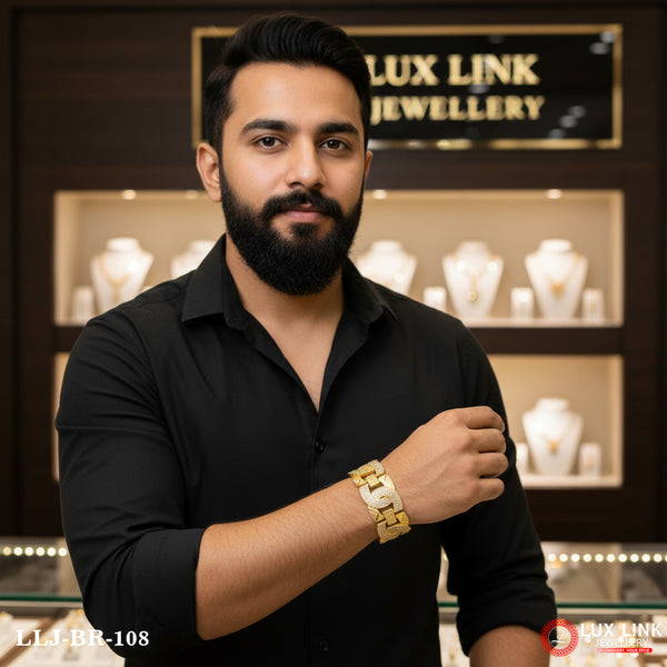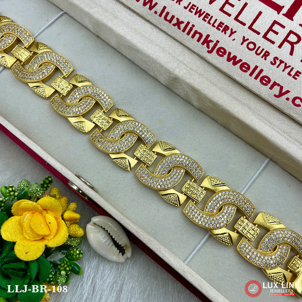 This Gents 1 Gram Gold Plated C into C Exciting Design Bracelet with Diamonds is the perfect combination of texture and shine. Crafted from brass and plated with 24k gold, it features an antique design for a royal yet hip hop look. Embellished with diamonds, this bracelet is perfect for your groom.