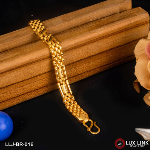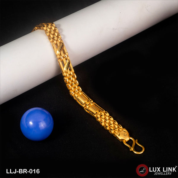 This 1 Gram Gold Plated High-Quality Eye-Catching Design Bracelet for Men, crafted from brass with Miligram Gold, is sure to be a favorite. Its trendy textured surface is shiny and eye-catching, making it a popular choice among the latest fashion trends. |